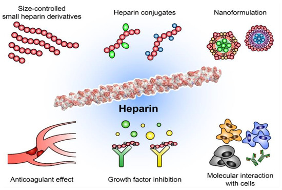 The study of the use of heparins or heparin derivatives in cancer treatment began recently, showing promising results in terms of their ability to treat several tumors [60]. Cancer is one of the leading causes of death worldwide, and some cancer patients receive UFH or LMWH to prevent cancer-associated thrombosis (CAT) or blood coagulation. The use of heparin in cancer patients has shown various therapeutic effects; thus, scientists have attempted to modify heparin’s molecular structure to enhance its anti-cancer effects. In particular, heparin conjugates that have been chemically modified with other drugs or molecules have several advantages in terms of decreasing the bleeding toxicity of heparin as well as enhancing its biological activities. For example, when heparin binds to hydrophobic molecules such as cholesterol or bile acids, its anti-cancer effect can be increased along with a loss of its anticoagulant effect [61,62]. Various heparin and bile acid conjugates with taurocholic acid (TCA) or deoxycholic acid (DOCA) have been prepared and their ability proven, resulting in delayed tumor growth and metastasis [63,64]. Heparin–taurocholate conjugate (HT10) or heparin–DOCA conjugate (H-DOCA) were shown to inhibit tumor growth and metastasis while regulating the activity of tumor-related growth factors such as vascular endothelial growth factor A (VEGF A). VEGF A has a heparin-binding domain in its structure [65,66]. Recently, the target range of heparin derivatives was extended to tumor-related proteins such as transforming growth factor-β1 (TGF-β1), CXCL12, vascular endothelial growth factor C (VEGF C), and heparanase [67,68,69].
