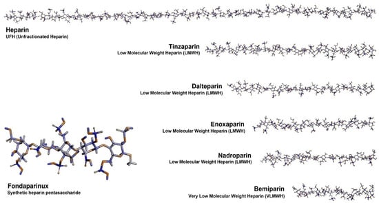 To overcome several problems of UFH, such as unwanted interactions with plasma proteins, low-molecular-weight heparin derivatives have been prepared and clinically used (Figure 2). The optimal heparin molecular structure and size might be derived through structural analysis of heparin based on computer simulation. Smaller heparins such as LMWH have shown better pharmacokinetic and pharmacodynamic profiles because their molecular size is optimized for targeting Factor Xa to exert anticoagulative effects [33,34]. Commercially available LMWHs include enoxaparin, nadroparin, tinzaparin, reviparin, and dalteparin [35]. Although their anticoagulant effects are more predictable and dose-dependent than those of UFHs, they have higher anti-Xa/anti-lla activity ratios compared with UFH. Among the LMWHs, tinzaparin and dalteparin have molecular weights that are higher than those of others by 1000 to 2000 Da [12]. On the other hand, the average molecular weights of enoxaparin and nadroparin are 4300–4500 Da. LMWH, those who have low molecular weight, have low activity against Factor lla (thrombin). Therefore, LMWH derivatives have a higher ratio of anti-Xa activity to anti-lla activity [36]. These substances are widely used across the world as anticoagulants [7,37]. There are subtle differences in the structure of the two LMWHs. Enoxaparin, for instance, is usually prepared from UFH via a chemical b-elimination reaction so that 1,6-anhydrosugar residues are present at the reducing end. However, nadroparin does not have a reducing end because it is obtained by nitrous acid depolymerization.