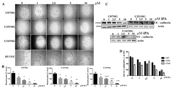 Glioblastoma cells are able to form vessel-like networks, characteristic VM structures in tumor tissues contributing functionally to tumor progression [,]. When U87MG, U251MG, and U343MG human glioblastoma cell lines are cultivated in 3D-Matrigel® (ECM), under serum-free conditions, they showed considerable tube-forming ability similar to those formed by HUVECs (Human umbilical vein endothelial cells) (Figure 1A). A hallmark of vasculogenic mimicry is VE-cadherin expression while they do not express the endothelial marker CD31 (data not shown) [,]. To assess the iPA effect on VM formation, we treated the GBM cells on the Matrigel-coated wells with iPA at concentrations ranging from 1 to 10 µM and then carried out a three-dimensional (3D) culture VM tube formation assay for 18 h. As shown in Figure 1A, the GBM cell lines treated with the vehicle alone formed complete tubular channels within 15 h, in contrast, the tube formation was inhibited by iPA treatment at the same time as well as for HUVEC cells, in vitro model of angiogenesis. VM tube formation of GBM cells was dramatically inhibited by 85% for U87MG, 92% for U251MG, and 89% for U343MG at 10 µM of iPA after 18 h. The total tube area of each group was determined using ImageJ (Figure 1B). To confirm that iPA’s ability to hinder tube formation is not due to cell proliferation inhibition of GMB cells, we performed an MTT assay with various concentrations of iPA (1–10 µM) after 18 h of treatment. We did not observed significant changes in the cell proliferation rate of GBM cells and HUVEC cells treated with iPA (1–10 µM) for 18 h in comparison to the untreated group (Figure S1). To examine the iPA effect on VE-cadherin expression involved in VM formation, we analyzed the protein levels by Western blot in GBM cell lines treated with iPA for 18 h (Figure 1C,D).