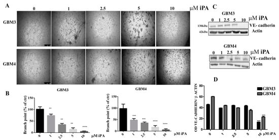 VE-cadherin expression was strikingly downregulated by treatment of iPA mostly at 5 and 10 µM in comparison with cells treated with vehicle alone, suggesting that the downregulation of VE-cadherin is associated with iPA-inhibited VM formation in GBM cells. Afterwards, we evaluated the iPA effects on VM of cells isolated from fresh primary tumor resection of glioma patients. The primary GBM cells (GBM3 and GBM4) were characterized for the mutational status of IDH1/IDH2, methylation of MGMT and p53, and EGFR amplification (Table 1) as described in the Materials and Methods. The GBM primary cells in the control group formed vessel-like networks in the Matrigel within 18 h, (Figure 2A). VM tube formation of GBM primary cells was dramatically inhibited by 85% for GBM3 and 92% for GBM4 at 10 µM of iPA at after 18 h of treatment (Figure 2B). Moreover, we observed that iPA do not inhibit the cell viability of the primary cells at 18 h (Figure S1). We analyzed the VE-cadherin protein levels by Western blot in primary cells treated for 18 h with iPA at several concentrations (Figure 2C,D). VE-cadherin protein levels were reduced by treatment with iPA at 10 µM for GBM 3 and at 2.5 to 10 µM for GBM4 in comparison with cells treated with vehicle alone. The GBM cells are negative to endothelial marker CD31 [] (data not shown). Recently, glioma stem cells (GBM CSC) have been shown to contribute to VM formation as well as angiogenesis. Then, we assessed the iPA effect on VM in CSCs (GBM1 and GBM2), isolated from tumor biopsies of patients affected by GBM []. iPA at 10 µM reduced cell ability to form vessel-like networks in the Matrigel after 24 h of treatment (Figure S2A,B). Furthermore, we observed any significant change in cell viability at 10 µM for GBM1 and GBM2 after 24 h of treatment (Figure S2C,D).