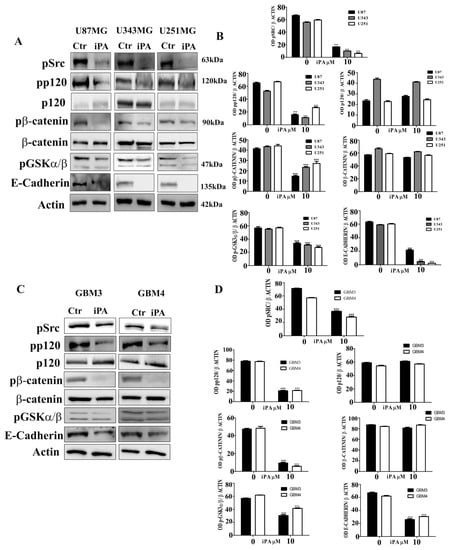 Western Blot analysis was used to assess iPA effect on levels of AJ proteins at 18 h (A) iPA reduced pSrc, pp120 catenin, pβ-catenin, pGSK3α/β and E-cadherin protein in U87MG, U343MG, and U251MG stabilized cell lines. (B) Densitometric analysis of each Western Blot. (C) iPA effect on AJ protein levels at 18 h on GBM primary cell lines (GBM3 and GBM4), iPA reduced pSrc, pp120 catenin, p β-catenin, pGSK3α/β, and E-cadherin protein. (D) Densitometric analysis of each Western Blot. Results are expressed as the mean ± SD of four independent experiments conducted in triplicate. (ANOVA, *** p < 0.001).