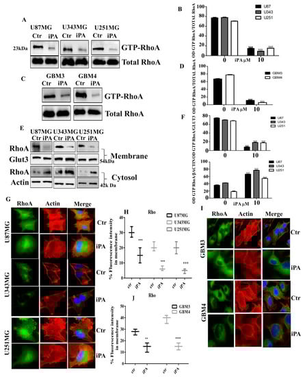 Effect of iPA on RhoA GTPase activity. Western Blot analysis showing the reduction in GTP-RhoA levels in iPA treated (A) U87MG, U251, U343 cells and (C), GMB primary cells line (GBM 3; GMB 4) at 18 h. (E) Western Blot analysis showing RhoA protein levels in membrane/cytosol fractions obtained from iPA treated and untreated GBM stabilized cell lines at 18 h. (B,D,F) Densitometric analysis of each Western Blot panel. Immunofluorescence staining of RhoA (green signal) and Actin (red signal, Phalloidin) in iPA treated and untreated. (G) GBM stabilized and (I) primary cell lines at 18 h. The Merge panel shows the overlapping of the two signals (green signal + red signal): in iPA treated cells, RhoA is reduced from the membrane. (H,J) The rate of F-actin was quantified and data are plotted as boxplots. Results are expressed as the mean ± SD of four independent experiments conducted in triplicate. (ANOVA, ** p < 0.01, *** p < 0.001, **** p < 0.0001).
