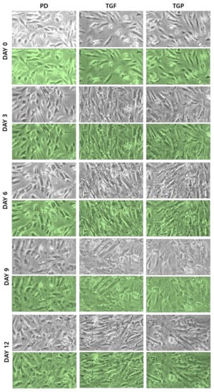 Morphological changes during differentiation of hUDSCs to SMCs using the indicated factors. Morphological changes observed on days 0, 3, 6, 9, and 12 during differentiation of hUDSCs into SMCs. (Magnification, 40×). PD: PD98059, TGF: TGF-β1, TGP: TGF-β1 and PD98059.