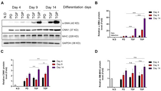 The expression of SMC-specific marker proteins in SMCs differentiated from hUDSCs at day 4, 9, and 14 of differentiation. The expression of α-SMA, CNN1, and SM-MHC was analyzed by Western blot. (A) The representative blots are shown. (B–D) Densitometry quantification of the relative expression of proteins was performed using the ImageJ software. Data are presented as mean ± SEM from three independent experiments; n.s.: no significance, ** p < 0.01, *** p < 0.005.