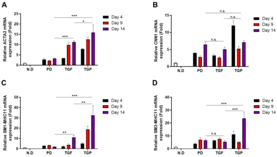 The expression of SMC-specific maker mRNA in SMCs differentiated from hUDSCs at day 4, 9, and 14 of differentiation. The mRNA expression of (A) ACTA2 (alpha-smooth muscle actin), (B) CNN1 (calponin), (C) SM1-MHC11 (smooth muscle 1 myosin heavy chain), and (D) SM2-MHC11 (smooth muscle 2 myosin heavy chain) was analyzed by qRT-PCR. The expression of cyclophilin B was used as an internal control: PD; PD98059, TGF; TGF-β1, TGP; PD98059, and TGF-β1. Data are presented as mean ± SEM from three independent experiments. n.s.: no significance, * p < 0.05, ** p < 0.01, *** p < 0.005.