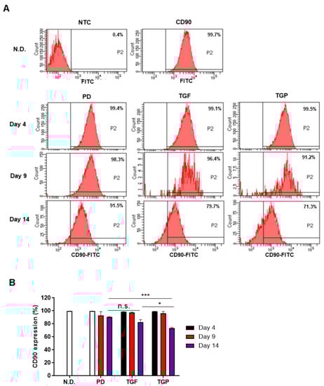 The expression of CD90 in SMCs differentiated from hUDSCs at days 4, 9, and 14 of differentiation. The expression of CD90 was analyzed by flow cytometry. (A) The values in the representative flow cytometry histograms indicate the percentages of CD90-expressing cells. (B) The percentage of CD90-expressing cells was analyzed from three independent experiments. Data are presented as mean ± SEM from three independent experiments. n.s.: no significance, * p < 0.05, *** p < 0.005. N.D.; undifferentiated, PD; PD98059, TGF; TGF-β1, TGP; PD98059 and TGF-β1.