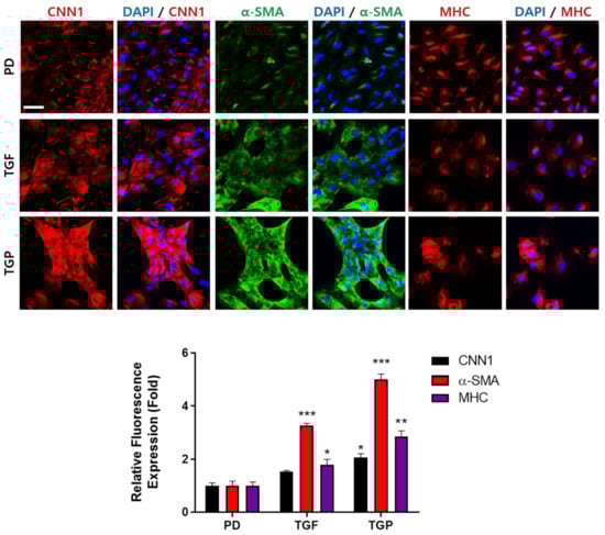 Immunocytochemical analysis of α-SMA, CNN1, and SM-MHC protein expression in differentiated SMCs: PD; PD98059, TGF; TGF-β1, TGP; PD98059 and TGF-β1. Scale bar indicates 50 μm: * p < 0.05, ** p < 0.01, *** p < 0.005, * vs. PD.