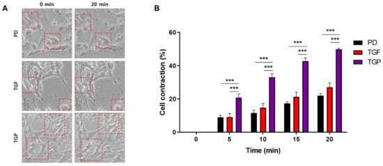 Contractile strength of the differentiated SMCs from hUDSCs. (A) Morphology of contractile SMCs. The cells were treated with carbachol to induce contraction, and images were obtained at 0 and 20 min after induction. (B) Percentage of carbachol-induced contracting cells. Data are presented as mean ± SEM, n = 6: PD; PD98059, TGF; TGF-β1, TGP; PD98059 and TGF-β1. *** p < 0.005 vs. PD or TGF group.