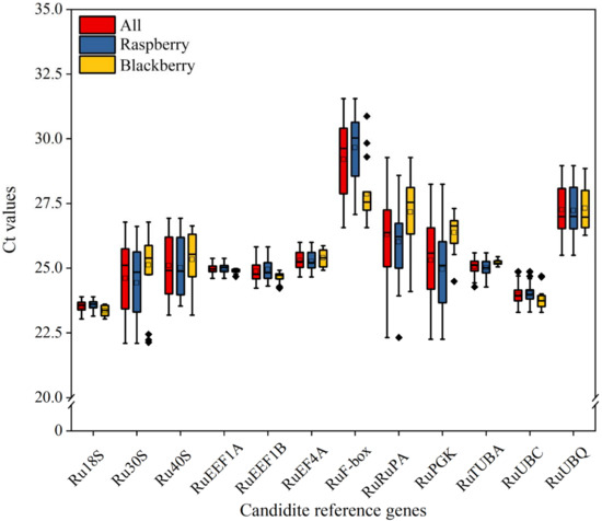 In this study, 12 genes (Ru18S, Ru30S, Ru40S, RuTUBA, RuEEF1A, RuEEF1B, RuEF4A, RuF-box, RuUBC, RuUBQ, RuPA, and RuPGK) were selected as candidate reference genes. The primer annealing temperature was between 60 °C and 61 °C, and the amplification product length was between 72 bp (RuF-box) and 193 bp (RuEEF1B) (Table 1). The green fruits, immature fruits and mature fruits, leaves, stems, and stem apexes of raspberry and blackberry were used as templates to amplify different candidate reference genes. The specificity of the primers was evaluated by the RT-qPCR solution curve, and the results showed that all the target reference genes had a specific single peak; that is, all the primers had good specificity and could be used for the RT-qPCR analysis of gene expression. The expression level analysis of 12 candidate reference genes showed significant differences in cycle threshold (Ct) values among all 72 samples, and there were also differences in Ct values of internal reference genes between different cultivars of raspberry and blackberry (Figure 1). For all samples, the Ct values ranged from 22.101 to 31.549, with a mean of 25.453. The ranges of RuEEF1A (24.607–25.381) and Ru18S (23.037–23.893) gene expressions were smallest, and the ranges of RuPA (22.322–29.277) and RuPGK (22.249–28.238) gene expressions were largest.