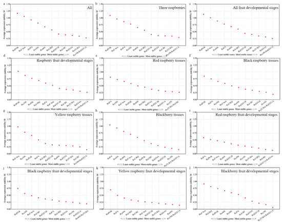The average expression stability (M) values of the 12 candidate reference genes using geNorm analysis. Results from (a) All 72 samples; (b) Three raspberries; (c) All fruit developmental stages; (d) Raspberry fruit developmental stages; (e) Red raspberry tissues; (f) Black raspberry tissues; (g) Yellow raspberry tissues; (h) Blackberry tissues; (i) Red raspberry fruit developmental stages; (j) Black raspberry fruit developmental stages; (k) Yellow raspberry fruit developmental stages; (l) Blackberry fruit developmental stages. The least stable genes are listed on the left, while the most stable genes are listed on the right.