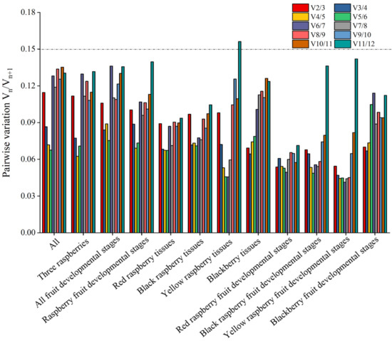 geNorm analysis of paired variation V values of 12 candidate reference genes. Vn/Vn + 1 values are used to determine the optimal number of reference genes. The cut-off value to determine the optimal number of reference genes for RT-qPCR normalization is 0.15.