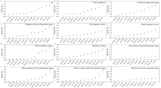 Gene expression stability of 12 candidate reference genes using NormFinder analysis. The lower the stability value, the more stable the expression level. (a) All 72 samples; (b) Three raspberries; (c) All fruit developmental stages; (d) Raspberry fruit developmental stages; (e) Red raspberry tissues; (f) Black raspberry tissues; (g) Yellow raspberry tissues; (h) Blackberry tissues; (i) Red raspberry fruit developmental stages; (j) Black raspberry fruit developmental stages; (k) Yellow raspberry fruit developmental stages; (l) Blackberry fruit developmental stages.