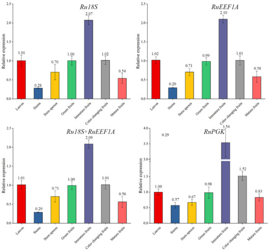 The RuEEF1A reference gene was the fourth most stable in red raspberry tissue, while in the other groups, it was in the top three. In short, RuPGK was the least stable reference gene, and RuEEF1A and Ru18S were the most stable reference gene combinations in all sample analyses.
