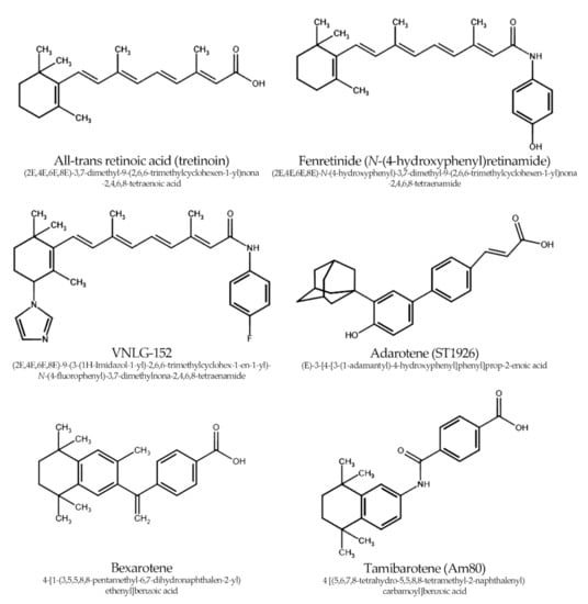 Some studies have highlighted that low water solubility is an obstacle in developing new drugs based on the retinoid structure. Natural vitamin A is a classical lipid-soluble vitamin, and its derivatives—often containing hydrophobic benzene rings—are characterized by even higher lipid solubility. The solution to this problem is to replace the benzene ring with heteroaryl aromatic moieties []. The chemical structure of ATRA and the main synthetic retinoids that are discussed in this review are shown in Figure 1.