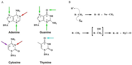 Methylation sites in nucleic acids. (A) Methylation positions in nitrogenous bases of a single- and double-stranded nucleic acid that are characteristic of the SN1 mechanism (blue), SN2 mechanism (red), or both types (green), epigenetic enzyme-catalyzed cytosine methylation (violet). (B) Schemes of demethylation via the mechanisms of nucleophilic substitution and oxidative demethylation.