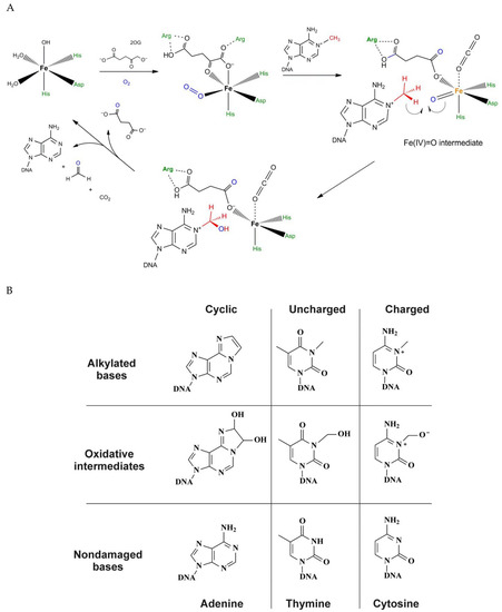 (A) The mechanism of catalytic oxidation of a methyl group by DNA dioxygenases as exemplified by N1-methyladenine (m1A) demethylation by prokaryotic DNA dioxygenase AlkB. (B) Oxidative repair of cyclic, uncharged, and charged alkylated bases [31].