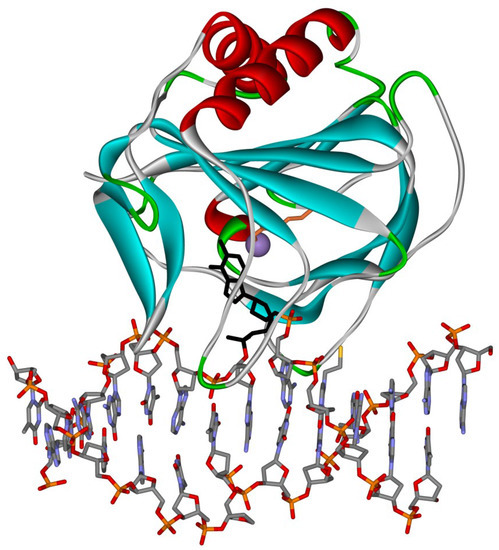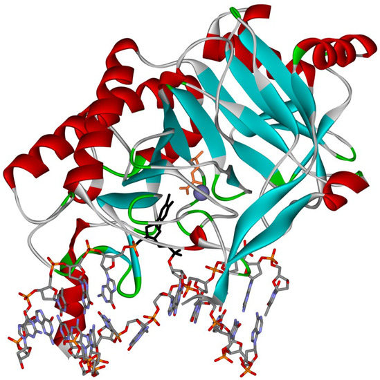 Three-dimensional structure of a complex of AlkB with DNA (Protein Data Bank ID: 3BIE). The figure shows damaged nucleotide m1A in the active site of the enzyme (black) and catalytic ion Mn(II) (purple).