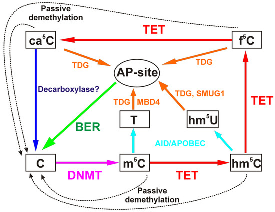 It must be pointed out that after the first catalytic cycle of m5C oxidation, hm5C is formed, which can be deaminated by enzymes of the AID/APOBEC family to 5-hydroxymethyluracil (hm5U). This base is removed from DNA by either TDG or SMUG1 (single-stranded monofunctional uracil-DNA glycosylase 1), and in this way, the BER pathway is initiated too [112]. Nonetheless, this mechanism is still debated since it has been reported that purified deaminases AID/APOBECs are unable to catalyze the conversion of modified cytosines in vitro [113]. As another pathway for the removal of m5C conversion products, the involvement of decarboxylase for the direct conversion of ca5C to cytosine has been theorized but not yet confirmed experimentally [114].