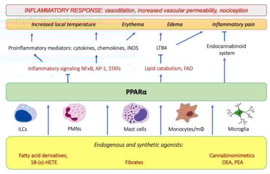 Peroxisome proliferator-activated receptors (PPARs) belong to a family of nuclear receptors that act as transcription factors activated by lipid-soluble ligands. Such ligands are able to cross the plasma membrane directly and bind the intracellular target proteins. PPARs are represented by three isotypes, PPARα, PPARβ/δ, and PPARγ, encoded by separate genes. They show tissue-specific expression patterns and mainly govern lipid, carbohydrate, and amino-acid metabolism, as well as exert other pleiotropic functions, including immunomodulatory activities. All three PPAR isotypes exhibit potent anti-inflammatory properties and have a strong impact on various aspects of the physiology of the immune system. In this review, we focus on peroxisome proliferator-activated receptor alpha (PPARα), which is particularly responsible for the regulation of fatty-acid catabolism and ketogenesis [,], also in addition to being deeply involved in the modulation of innate immunity responses. Below, we outline the active participation of PPARα in physiological processes that operate behind all four cardinal symptoms of inflammation, i.e., alleviating edema and pain and contributing to resolution of acute phase.