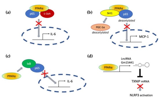 Transrepressive activity toward nuclear factor κB (NF-κB), activation protein (AP-1), and signal transducers and activators of transcription (STATs) is responsible for PPARα’s profound anti-inflammatory action. PPARα physically interacts with the p65 Rel homology domain through its C-terminal fragment and simultaneously binds the JNK-responsive part of c-Jun with its N-terminal fragment (Figure 2a) []. Formation of this complex sequesters p65 and c-Jun from binding to the IL-6 promoter and blocks IL-1-induced IL-6 production. The direct inhibitory interaction between PPARα and NF-κB p65 subunit was also reported in cardiomyocytes []. In this case, sirtuin 1 (Sirt1) initiated formation of the Sirt1–PPARα–p65 complex, which led to PPARα-dependent p65 inactivation and transrepression of proinflammatory NF-κB-regulated genes, such as monocyte chemoattractant protein 1 (MCP1, Figure 2b) []. Sirt1 induced p65 deacetylation, which also had a negative impact on NF-κB activity because acetylation is required for its activity []. The deacetylation effect was absent after treatment with PPARα antagonist GW6471 or in PPARα−/− cells, which indicates PPARα involvement [].