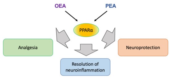 The presence of OEA and PEA in CNS implicates their activity in the physiology of neurons and glial cells. Both compounds were shown to exert beneficial effects by counteracting the glial inflammatory responses and by providing cytoprotection over neuronal cells and their activities in various neuropathic states. Neuroinflammation and exaggerated glial reactivity are associated with numerous neurodegenerative diseases, traumatic injuries, ischemia/reperfusion stress, and neuropathic pain [,,]. The brain is regarded as ‘an immune-privileged’ organ, protected from peripheral proinflammatory stimuli by the blood–brain barrier, but microglia, astrocytes, and mast cells are capable of triggering neuroinflammation []. Aberrant or chronic activation of these cells in the CNS leads to increased expression of TLRs, cytokines (TNFα, IL-6), chemokines (CXCL6) metalloproteinases, ROS, and RNS, which results in the loss of calcium homeostasis, neuronal damage, or apoptosis [,,]. The potential of lipid amides, called ALIAmides (autacoid local injury antagonists) to counteract neurogenic inflammation and mast-cell degranulation, was proposed by Rita Levi-Montalcini, a Nobel laureate (1988), for her discoveries in the field of neurobiology []. Indeed, numerous studies demonstrated that OEA and PEA, classified as ALIAmides, could provide neuroprotection via downregulation of inflammatory responses in the brain through modulation of glial cell functions. Benito and colleagues discovered that N-fatty acylethanolamines (OEA, PEA, AEA) and synthetic agonists of PPARα (Wy-14643) and PPARγ (troglitazone) alleviate the inflammatory response induced by the treatment of astrocytes with β-amyloid peptide fragments []. The anti-inflammatory effects were mediated by PPARα, PPARγ, and TRPV1 activity, but not through CB1 or CB2 []. The neuroprotective action of PEA and an endocannabinoid 2-AG was observed in an excitatory model of neuronal damage in organotypic hippocampal slice cultures []. PEA and 2-AG rescued about 50% of neurons from NMDA-induced cell death, acting on microglial cells, albeit through different and mutually suppressing mechanisms. PEA blocked microglial inflammatory activities, such as NO production and the acquisition of ameboid morphology, characteristic of an activated condition []. These effects were associated with PPARα nuclear translocation, which suggests its involvement in the process.