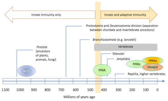 PPARs and NOS serve as an illustrative example of how the elements of innate immunity and their regulatory mechanisms coevolved in the animal kingdom. On the one hand, NOS belongs to a large family of evolutionarily ancient enzymes that includes numerous pro- and eukaryotic flavodoxins [,]. There have been several hypotheses of their reciprocal relationship in invertebrates in the function of hemolymph homeostasis maintenance and the destruction of pathogens, i.e., probably unified in hemocytic NOS, as is the case for horseshoe crabs [,]. On the other hand, PPARs, despite their origin in the nuclear receptor family that emerged in metazoans, evolved in animals only as late as in the branch of Deuterostomata, whereas, in chordates, their presence dates from the evolution of Branchiostomata []. Consequently, they are present in all the vertebrates, but (except for Branchiostomata) absent in invertebrates []. Their presence seems to correspond to the evolution of the immune system and adipose tissue, but their tissue specificity does not overlap with their functional diversification. The most basic branch of this family seems to be represented by PPARγ, and the evolution of the whole family comprised two duplications of the genes, the first moving PPARγ apart, and the other dividing the other group into the PPARβ and α subfamilies []. This must have taken place on the level of ancient, primitive Teleostei [,].