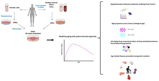 In this regard, the description of potential aging-related biomarkers such as telomere length, DNA damage, mitochondrial dysfunction, reactive oxygen species, autophagy, and epigenetic marks [20] opens the possibility to use PDOs as a predictive tool of disease outcome. In addition, the discovery and validation of new aging-related biomarkers using PDOs is a promising field. PDOs could be exposed to panels of clinically relevant anti-aging drugs in order to identify better treatment schemes in bench-to-bedside approaches (Figure 1).