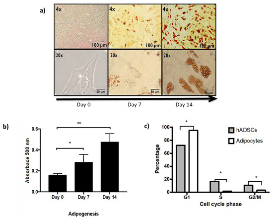 In vitro adipogenesis from hASCs. (a) Representative light microscopy images showing Oil Red O staining to identify lipid vesicles acquired through differentiation (day 0, 7, and 14). 4× and 20× magnification of the same fields. (b) Spectrophotometric quantification at 500 nm of the Oil Red O staining performed through adipogenesis in three independent experiments, Student’s t test vs control * p < 0.05, ** p < 0.01. (c) Post-mitotic arrest of adipocytes. Percentage of cells in the different stages of the cell cycle, comparing hASCs and 14-day adipocytes. Three independent experiments with experimental replicate were carried out. One way ANOVA test, * p < 0.05.