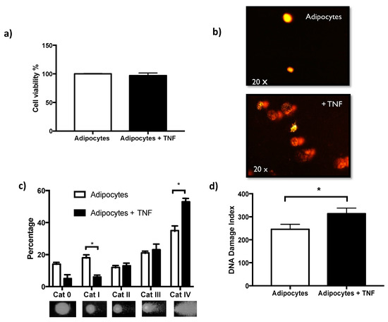 TNFα non affects cell viability and induces DNA damage. (a) Cell viability of adipocytes and adipocytes treated by 24 h with TNFα 125 ng/mL, three independent experiments were carried out. Student t test p > 0.05 non-significant. (b) DNA damage images representatives of comet assay, acquired with Komet V5.0. (c) Percentage distribution of DNA damage categories (Cat 0 less damage to Cat IV higher damage), in adipocytes and adipocytes treated with TNFα; three independent experiments were carried out. Two-way ANOVA test * p < 0.05. (d) DNA damage-index differences induced by TNFα treatment, Student’s t test * p < 0.05.