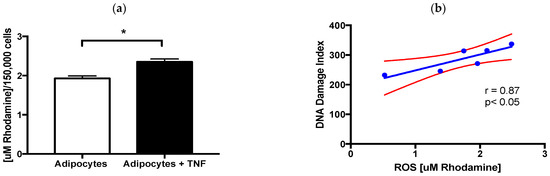 ROS and DNA damage. (a) Intracellular ROS levels induced by TNFα treatment (24 h, 125 ng/mL) in newly differentiated adipocytes, three independent experiments with experimental replicate were carried out. Student’s t test * p < 0.05. (b) Positive relationship between intracellular ROS levels and DNA damage index induced by TNFα. Pearson´s correlation, coefficient of correlation r = 0.87 and * p < 0.05.
