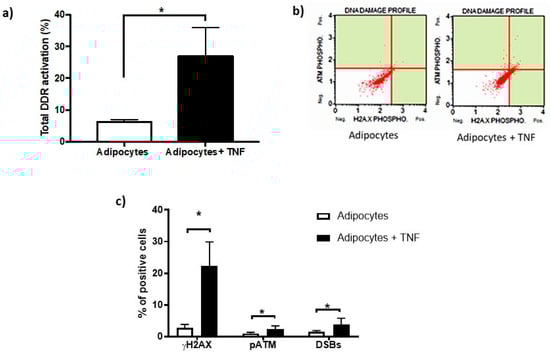 DNA Damage Response (DDR) activation basal and after-TNFα treatment. (a) Percentage of DNA damage response activation in adipocytes induced by TNFα (125 ng/mL, 24 h), three independent experiments with experimental replicate were carried out. Student t test * p < 0.05. (b) The capture of representative cytofluorometry analyzes as images that show γH2AX in X-axis, pATM in Y-axis. DSBs corresponds to the upper right signal, this means double stain. (c) Percentage of positive cells distribution as part of DNA damage response showing the TNFα effects. One-way ANOVA test * p < 0.05.
