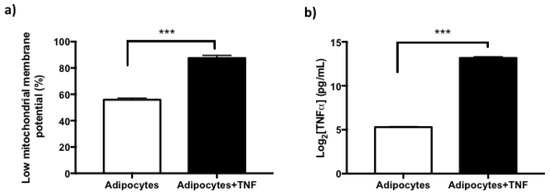 Secretory Senescence-Associated Phenotype (SASP) in adipocytes treated with TNFα. (a) Increase of newly differentiated adipocytes with low mitochondrial membrane potential by TNFα (125 ng/mL, 24 h) treatment, three independent experiments were carried out. Student t test *** p < 0.001 (b) Basal TNFα secretion levels in newly differentiated adipocytes and increase TNFα-secretion in adipocytes after TNFα treatment, three independent experiments were carried out. Student’s t test *** p < 0.001.