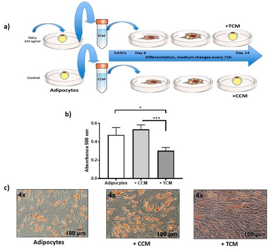 Effects of SASP on adipogenesis. (a) Experimental design followed to know the effect of the secretome on surrounding cells. Untreated (CCM) and TNFα-treated (TCM) adipocyte medium was harvested. The differentiation of hASCs was started six days prior in optimal conditions (as described in materials and methods) until day 6 of culture. The preadipocytes of these cultures were exposed to + CCM or + TCM and differentiation stimuli until day 14 of adipogenesis, changing the medium every 72 h. (b) Spectrophotometric quantification at 500 nm of absorbance of lipid droplets identified by Oil Red O staining at the end of adipogenesis, comparing control adipocytes with those treated with + CCM and + TCM. Three independent experiments were carried out. One-way ANOVA test * p < 0.05 and *** p < 0.001 (c) 4× magnification light microscopy images representative of Oil Red O staining. hASCs adipogenesis is not affected by secretions from untreated adipocyte (+ CCM), while the secretions of adipocytes treated with TNFα (+ TCM) limit adipogenesis showing lower staining of lipid droplets with Oil Red O.
