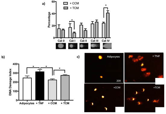 DNA damage persistent in Sustained DNA Damage Response (DDR). (a) Increase of the percentage distribution of DNA damage categories (Cat 0 less damage to Cat IV higher damage), after adipogenesis with Treated (TNFα) Conditioned Medium (+ TCM), three independent experiments were carried out. Two-way ANOVA test * p < 0.05. (b) The DNA damage index increases after adipogenesis in TCM relative to differentiation in CCM. The comparison shown including the basal damage of the adipocytes and adipocytes treated with TNFα from which the conditioned media come from (ANOVA multiple comparison analysis, * p < 0.05). (c) DNA damage images representatives of comet assay, acquired with Komet V5.0.