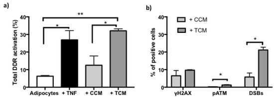Sustained DNA Damage Response (DDR) activation vs. basal. (a) Increased percentage of DNA damage response activation in adipocytes treated with TNFα (125 ng/mL, 24 h), and after adipogenesis in conditioned control medium (+ CCM) or treated control medium (+ TCM). Three independent experiments with experimental replicates were carried out. Multiple comparison analysis ANOVA * p < 0.05, ** p < 0.001 (b) Increases in the percentage of positive cells distribution of pATM and DSBs after adipogenesis with medium conditioned treated (+ TCM). Three independent experiments were carried out. One-way ANOVA test * p < 0.05.