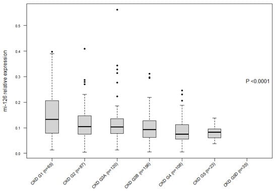 The present study is a follow-up of our previous work []. The characteristics of the cohort were previously described in detail in [,]. This large cohort was divided into seven CKD groups (stages G1,G2, G3a, G3b, G4, G5, and G5D for patients on dialysis) and one healthy group [,]. In this cohort, the all-cause mortality as well as the CV and renal events are archived as endpoints over a 5.5 year period. It has been shown that miR-126 levels were significantly lower from CKD stage G2 onwards compared to the controls []. When considering overall mortality, patients with levels of miR-126 below the median had a lower survival rate. Similar results were observed for CV and renal events []. In the present study, we tried to detect eventual associations between miR-126 expression and markers of endothelial dysfunction, on one hand, and uremic toxins, on the other hand, to obtain a better grasp of the interactions of these molecules in the CKD.