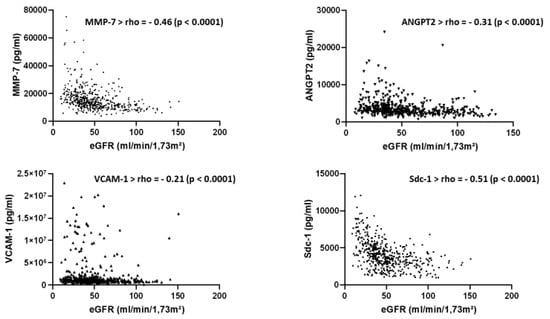 Association of the estimated glomerular filtration rate (eGFR) with the endothelial markers matrix metalloproteinase-7 (MMP-7); Angiopoietin 2 (ANGPT2); vascular cell adhesion protein 1; (VCAM-1) and Syndecan-1 (Sdc-1) in patients in different stages of CKD (Spearman’s rank correlation coefficient).
