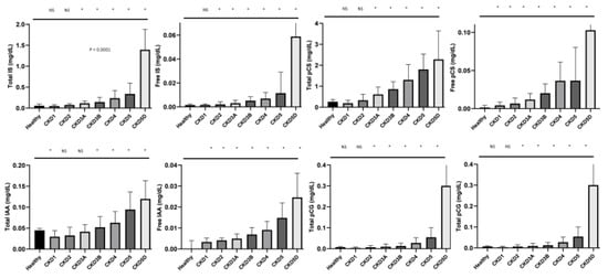 Levels of uremic toxins over the different stages of CKD. * p < 0.05 vs healthy. Abbreviations: NS, non-significant; IS, indoxyl sulfate; pCS, para-cresyl-sulfate; pCG, p-cresyl glucuronide; and IAA, indole acetic acid.