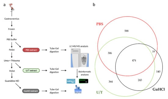 In this study, samples of gastrocnemius muscle were subjected to three sequential extractions, each one being analyzed by LC-MS/MS. In particular, phosphate buffer saline (PBS) was used to solubilize hydrophilic proteins (PBS extract), and then the insoluble part was treated with a combination of urea (U) and thiourea (T) to extract hydrophobic molecules such as membrane proteins, myofibrillar, and part of ECM proteins (U/T extract) []. Finally, the remaining insoluble fraction was treated with guanidine-HCl (GuHCl extract), one of the most efficient chaotropic agents which is known to extract poorly soluble, heavily cross-linked proteins, and proteoglycans. This approach has been reported to improve protein extraction from ECM-rich tissues (e.g., cartilage, tendon) [,] (Figure 1a).