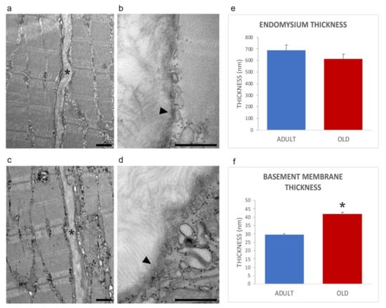 Ultrastructural images of the endomysium in adult (a,b) and old (c,d) gastrocnemius muscle. *, endomysium; arrowhead, basement membrane. Bars: 500 nm. The endomysium and basement membrane thickness are reported in panels (e) and (f), respectively. * p < 0.001.
