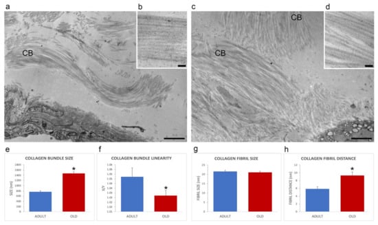 Ultrastructural images (a–d) of the perimysium of adult (a,b) and old (c,d) gastrocnemius muscle. CB, collagen bundle. (a,c), bars: 1 µm; (b,d), bars: 100 nm. Morphometric analysis of collagen bundles and collagen fibrils features are reported in the histograms (e–h). X/Y, ratio between the real length of the collagen bundle profile and the corresponding linear length. * p < 0.05.