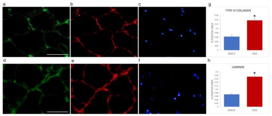 Type VI collagen (a,d) and laminin (b,e) immunolabelling of gastrocnemius cryosections in adult (a–c) and old (d–f) mice. DNA was counterstained with Hoechst (c,f). Bar: 50 µm. Panels (g) and (h), respectively, show quantification of the immunolabelling for type VI collagen and laminin expressed as % of total area). * p < 0.001.