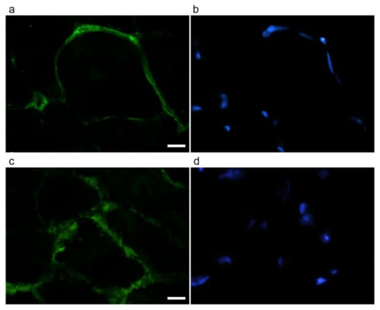 Type I collagen (a,c) immunolabelling of gastrocnemius cryosections of adult (a,b) and old (c,d) mice. DNA was counterstained with Hoechst (b,d). Bar: 10 µm.