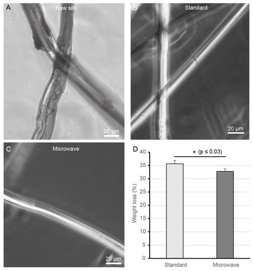Light microscopic images of silk fibroin samples: (A) Raw silk fibers consist of two silk fibroin fibers covered and glued by a layer of sericin. (B) Silk fibroin fibers after standard degumming (30 min boiling in 0.02 M Na2CO3) and (C) microwave degumming. The scale bar corresponds to 20 µm. (D) Mean weight loss after degumming. The weight loss after degumming is expressed as the mean of four independent experiments ± standard error of the mean (SEM).