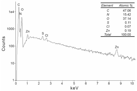 Energy-dispersive X-ray analysis (EDX) pattern of a silk film cast from silk fibroin dissolved in ZnCl2 and desalted by gel filtration. Data was recorded using an area analysis with a measuring area of 1 mm2. The inserted table presents the atomic percentage of the detected atoms.