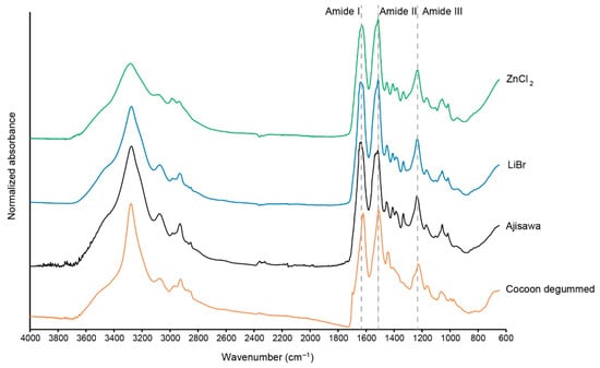 ATR-FTIR spectra of silk fibroin plotted as normalized absorbance versus wavenumber. Silk fibroin films cast from fibroin isolated using the three dissolution methods (Ajisawa, black; LiBr, blue; ZnCl2, green) were compared with degummed cocoon silk fibroin (yellow). Dashed lines show the bands for the three amides I-III.