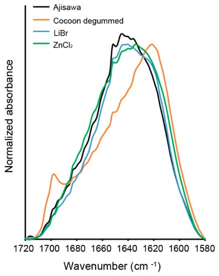 Hereafter, the regenerated silk fibroin solution from the three solvent variants was investigated by ATR-FTIR to clarify a possible influence of ZnCL2 on the structure of the silk fibroin molecule. A comparison of the spectra of the ATR-FTIR analysis shows that the silk fibroin dissolved with ZnCl2 does not differ from the fibroin dissolved with standard solvents (LiBr, Ajisawa). The bands for amides I, II, and III are in the same range for all solution variants studied. Therefore, based on the position of the amide bands, the three spectral patterns studied can be attributed to a silk fibroin material with β-sheet molecular conformation. The band detected in the spectrum of the studied silk fibroin fibers at 1698 cm−1 is due to the antiparallel arrangement of the fibrin chains in the fold-sheet domains of the silk filament [14].