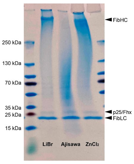 Finally, the results of the SDS-PAGE demonstrated that the ZnCl2 method presented has no effect on the structural integrity of the fibroin molecule (Figure 8) and no degradation occurs. The fibroin protein consists of one heavy chain molecule (350 kDa) [37] and one light chain molecule (26 kDa) [38]. Both molecules are linked by a disulfide bond between two cysteine amino acids to form a heterodimer. Five other heterodimers of heavy and light chain molecules are linked by a protein called fibrohexamerin/p25 (30 kDa, fhx/p25) [39] to form a so-called elemental unit in a molar ratio of 6:6:1 [40,41]. As with fibroin isolated by the LiBr method, all three subunits of the molecule isolated by the ZnCl2 method are intact and readily identifiable. In contrast, the Ajisawa method degrades the silk fibroin molecules [42].
