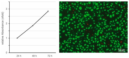 The viability and proliferation of cells on films at different days are an indicator of cellular compatibility and suitability for use as a medical device or for tissue engineering applications. As a preliminary approach to evaluate the cytocompatibility of silk fibroin films, the XTT assay was performed. The increase in cell number from 24 h to 72 h after colonization of the films is linear and shows proliferation of L929 cells on the silk fibroin films (Figure 9 left). In addition, a live-death staining was performed after 72 h of cultivation. Evaluation of this staining shows that only very few cells are dead (red fluorescence) whereas most cells are alive (green fluorescence). Taken together, both results show that silk fibroin films do not induce cytotoxic effects on L929 cells cultured directly on the films.