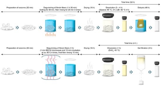 Comparison of the standard process for the production of regenerated silk fibroin (above) with the presented ZnCl2-based faster process (below).